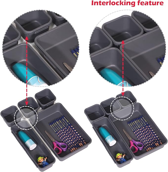 - THE EVERYTHING INTERLOCKING DRAWER ORGANIZER: No matter where you use this set of 22 durable desk drawer organizers and storage — in the kitchen, bathroom, vanity makeup, or office — this multipurpose desk drawer organizer tray shallow keeps your things in order. You can freely mix and match them to increase the storage capacity in your drawers to fit a variety of home and office needs.