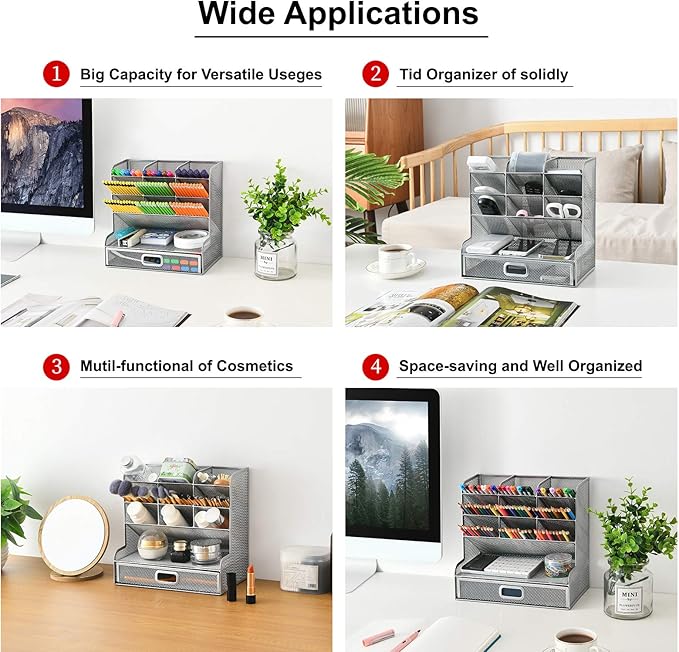 - 【SPACE SAVING】: This mesh organizer is convenient for storing and sorting small items such as pencils, markers, glasses and so on, helping you to save space. Make your desk look more neatly and cleanly.