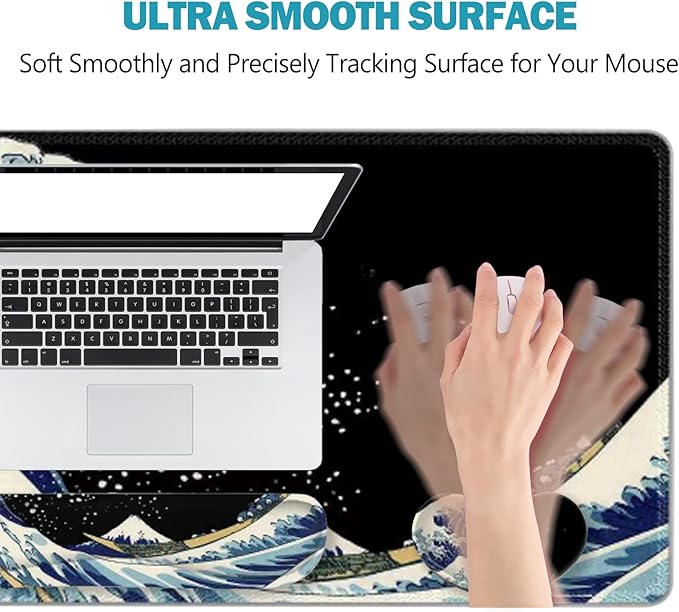 ToLuLu Extended Gaming Mouse Pad, Memory Foam Ergonomic Keyboard Mouse Wrist Rest Support Set, Large Desk Mat with Stitched Edges, Non-Slip Base Mousepad for Home Office Game Study, Wave of Kanagawa