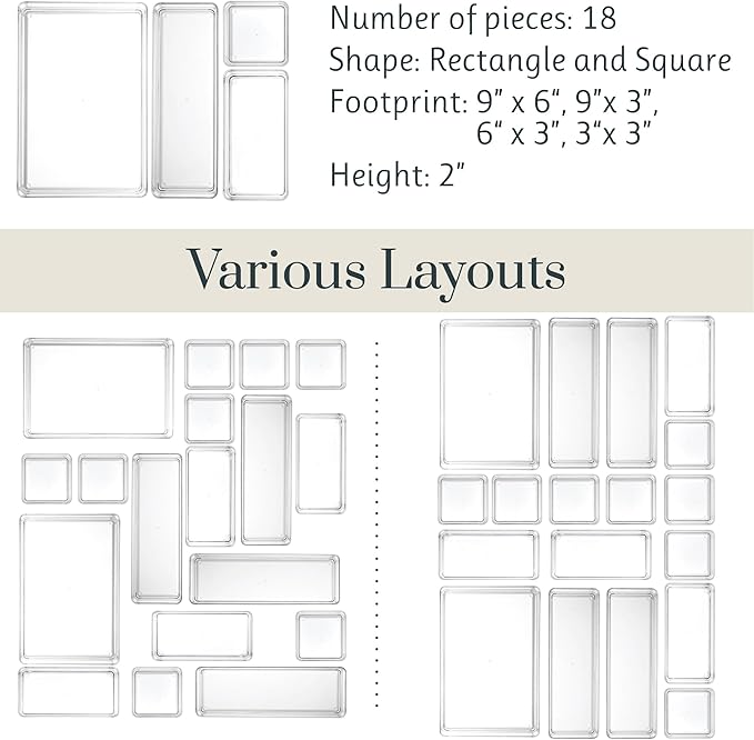 - Set of eighteen includes four different sizes (8) 3-inch by 3-inch, (4) 6-inch by 3-inch, (4) 9-inch by 3-inch, and (2) 9-inch by 6-inch shallow drawer organizers