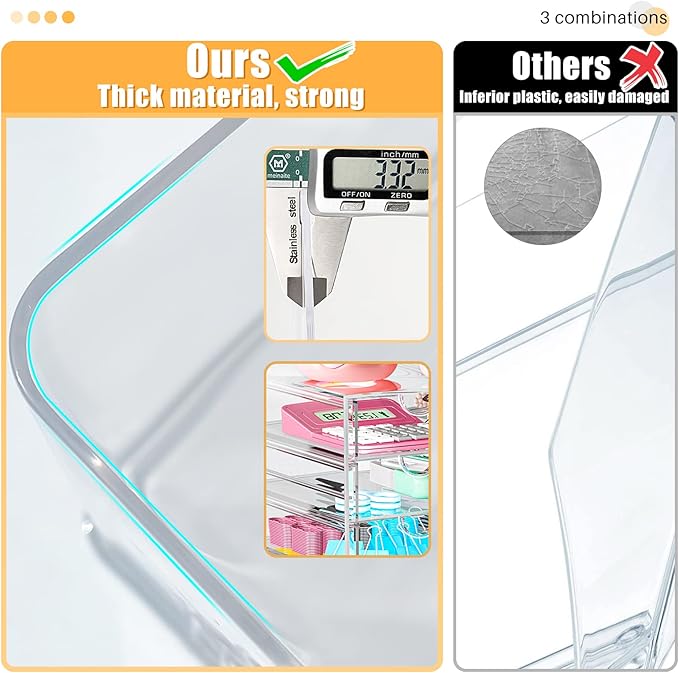 - Dustproof and High Quality: This clear Acrylic storage drawer is dust proof and waterproof, and can protect the items we put away from dust and water. In addition, the desk organizer is made of shatterproof plastic. The sturdy, transparent and fashionable design is compatible with decoration of any rooms. PLEASE DO NOT PUT IN DISHWASHER. Easily clean with soap and warm water.