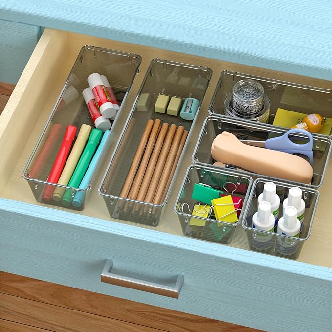 WOWBOX 6 Pack Clear Drawer Organizer Set, Acrylic Drawer Storage Trays, Storage Bins for Makeup, Cosmetics, Jewelries, Utensils, Gadgets, Office, Black