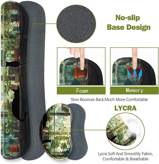 ToLuLu Extended Gaming Mouse Pad, Memory Foam Ergonomic Keyboard Mouse Wrist Rest Support Set, Large Desk Mat with Stitched Edges, Non-Slip Base Mousepad Home Office, Cute Green Japanese Kawaii Cat