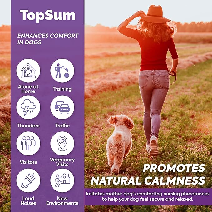 TopSum Calming Diffuser for Dog: Dog Pheromones Calming Diffuser Plug for Stress, Barking, Chewing, Pee Accidents & Separation Behaviors (Purple– 4 Refills)