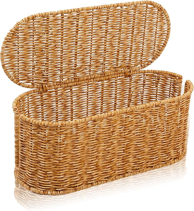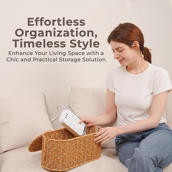 - Elegant & Safe Handwoven Synthetic Rattan: Our Cantalop Cord storage organizer with attached lid boasts a handmade polypropylene rattan like plastic, adding a touch of rustic elegance to any room. This cable organizer is carefully designed to hide wires and improve your space with a charming touch.