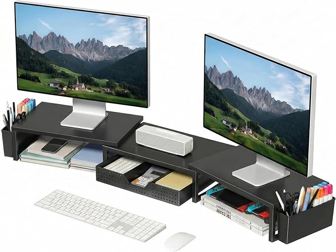 - 【Ergonomic Eye-Level Comfort】Say goodbye to neck pain. Easily raise your monitor or laptop to the perfect height with our ergonomic dual monitor stand. This ideal positioning reduces strain, improves posture, and keeps you comfortable all day long—whether it's work, study, or gaming
