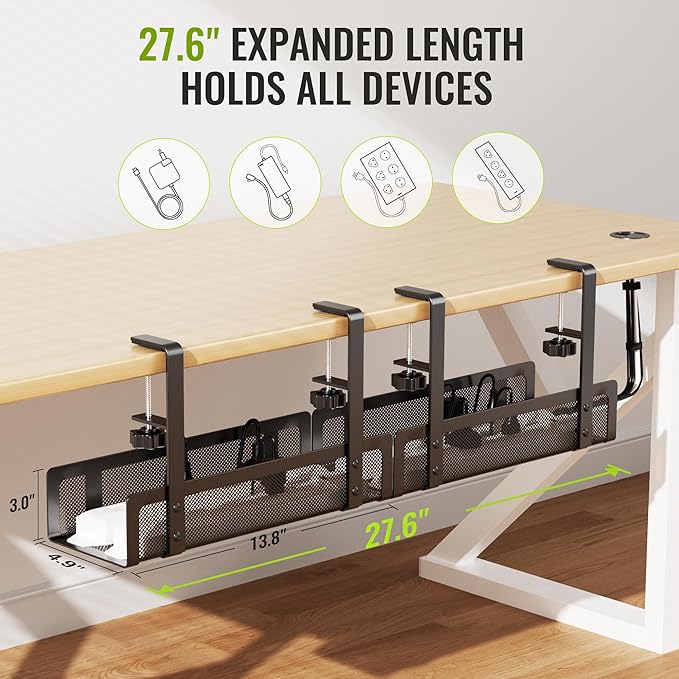 - What You Will Get - Great value under desk cable management kit contains 2 cable trays(Dimensions of 13.8"L x 4.9"W x 3.0"H), 4 cable clips and 6 cable ties. When aligned, the 2 trays create an extra-long 27.6 inch under desk solution. The rust-proof steel construction ensures durability, making it ideal for multiple devices in offices, home studios or gaming setups.