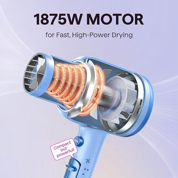 Wavytalk Hair Dryer, Blown Away Ionic Hair Dryer for Curly Hair with Diffuser, 1875W Fast Drying Blow Dryer with Ceramic Technology, 3 Attachments for All Hair Types, Light and Quiet, Light Blue