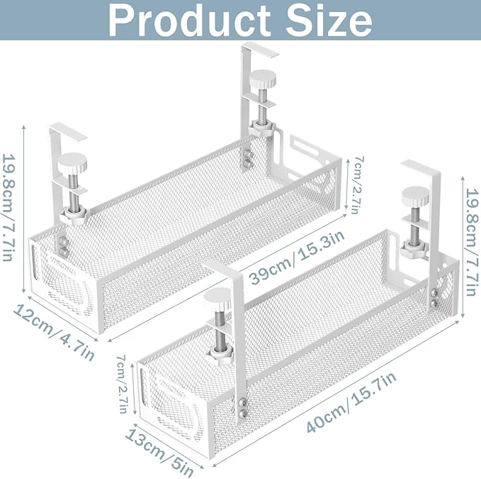 - 【Under Desk Cable Management Tray】Our cable management are suitable for the standing desk within 0.4" to 2" thick, and can withstand a weight of approximately 15 lbs. The cord organizer built-in non-slip rubber pads on the clamp to protect the desk surface from scratches. The desk accessories supports both inward and outward installation, you can easily change its position as needed.