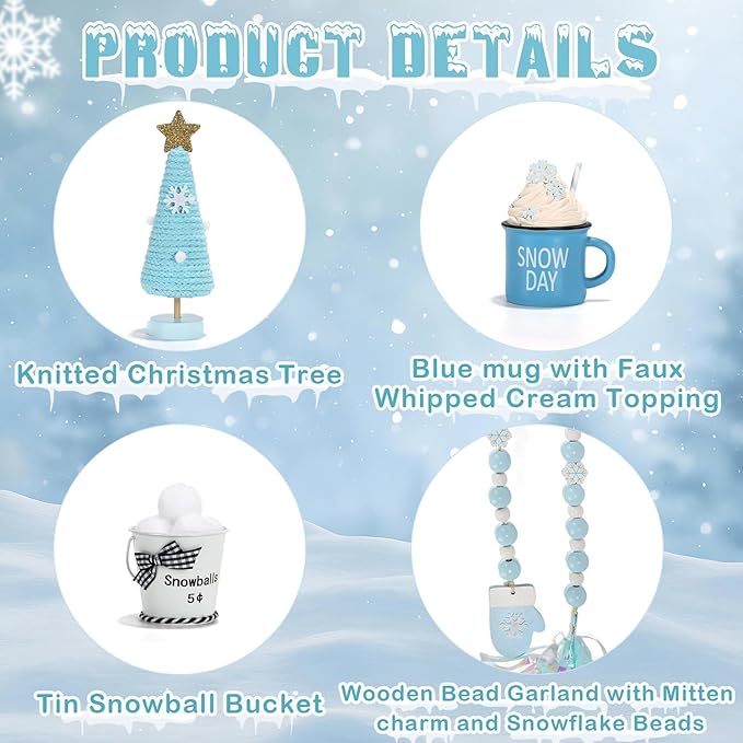 - Charming Winter Theme: Each piece features classic winter designs, such as a cute blue snowman, a knitted Christmas tree with a gold star on top and a tin snowball bucket. These pieces create a warm and inviting winter wonderland atmosphere, ideal for adding to your home's festive vibe