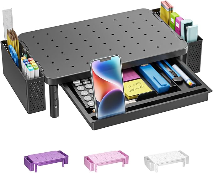 - Save Space: This monitor stand includes a built-in drawer and two hanging pen holders, offering ample storage space for office supplies and accessories, helping to keep your workspace tidy and productive