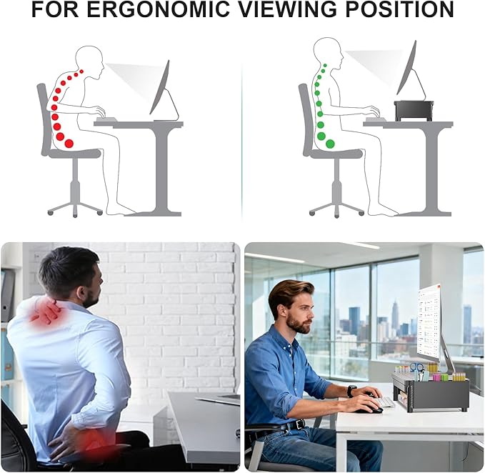 - Ergonomic: This computer riser for laptop, monitor, notebook, or any device by 4.6 inches, 5.4 inches, or 6.1 inches off the desk to create a comfortable viewing position and a healthier sitting position which helps reduce stress on the neck and back