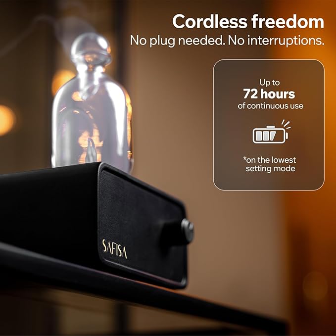 - Smart Features: Automatic scent diffuser with programmable timer. Wireless operation for flexible placement. Rechargeable battery provides up to 72 hours of continuous use. Intuitive controls for customized aromatherapy experience.